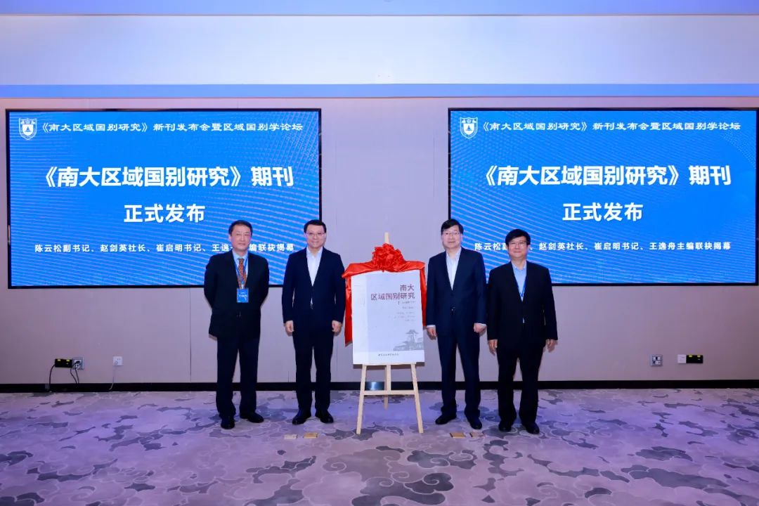 南京大学党委副书记陈云松、中国社会科学出版社社长赵剑英、外交学院党委书记崔启明、南京大学区域国别研究院院长王逸舟共同为《南大区域国别研究》新刊发布揭幕。