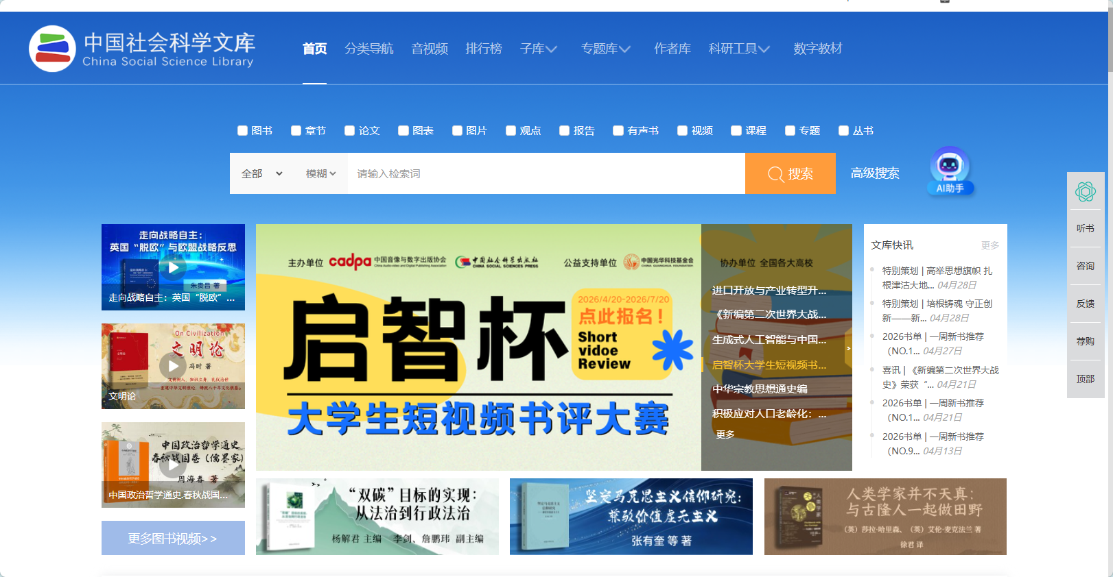 为深入贯彻全民阅读国家战略,落实 2026 年首个“全民阅读活动周” 相关部署,助力学术成果大众化传播与中华优秀传统文化创造性转化、创新性发展,中国社会科学出版社联合中国音像与数字出版协会、中国光华科技基金会,特举办 “启智杯”大学生短视频书评大赛。